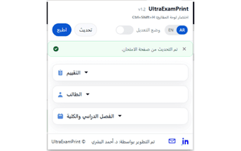 BB Ultra Exam Print with Cover는 원래 형식을 유지하면서 전체 Blackboard Ultra 시험 시도를 인쇄할 수 있도록 설계된 Chrome 확장 프로그램입니다. 이 도구를 사용하면 사용자는 스크린샷을 사용하지 않고도 시험을 인쇄할 수 있어 명확성과 가독성을 보장합니다. 이 확장 프로그램은 아랍어와 영어 두 가지 언어를 지원하며, 사용자의 언어 선호도에 맞춘 자동 생성된 표지 페이지를 제공합니다.